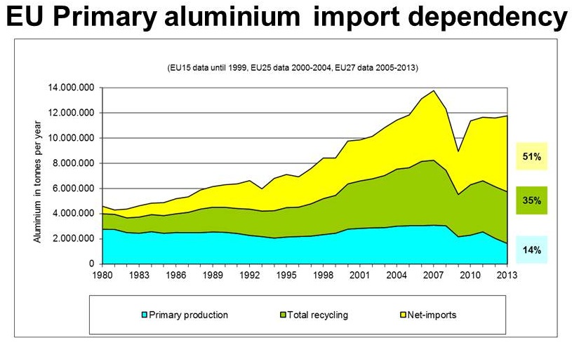 However, as the downstream production has constantly increased, and has recovered faster after the crisis, the import dependence of the EU aluminium industry has passed from roughly 35% to 50% (about 5.4 million tonnes imported in 2012 (f)).
