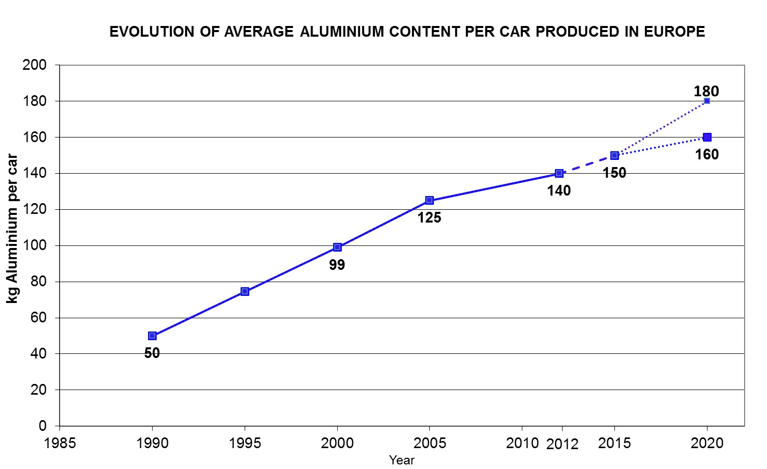 Une étude publiée par « Ducker Worldwide » en coopération avec l’Association Européenne de l’Aluminium (EAA) montre que la quantité d’aluminium utilisée par véhicule produit en Europe a presque triplé entre 1990 et 2012, passant de 50 à 140 kg. Les prévisions tablent sur 160 kg en 2020, et peut être même 180 kg si les petits et les moyens modèles suivent l’évolution constatée sur les véhicules de haut de gamme.