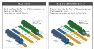Il rapporto mostra come, incrementando la capacità di assorbimento dell’energia della struttura anteriore di un autocarro, si può migliorare di molto le sue prestazioni nella capacità di assorbimento dell’energia in caso di collisione (Figura 3). Tuttavia l’adozione di dispositivi nel design di nuovi autocarri non dev’essere penalizzata. Perciò è necessario un cambiamento della direttiva 96/53/EC sulla dimensione e il peso, in modo tale che un miglioramento nella sicurezza ed efficienza del combustibile non influenzi la capacità del carico utile.