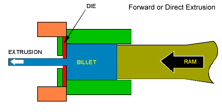 Extruded products constitute more than 30 % of the market for aluminium products in Europe of which the building industry consumes the majority. Aluminium extrusions are used in commercial and domestic buildings for window and door frame systems, prefabricated houses/building structures, roofing and exterior cladding, curtain walling, shop fronts, etc. Furthermore, extrusions are also used in mass transport for airframes, road and rail vehicles and in marine applications. The term extrusion is usually applied to both the process, and the product obtained, when a hot cylindrical billet of aluminium is pushed through a shaped die (forward or direct extrusion, see Figure 1). The resulting section can be used in long lengths or cut into short parts for use in structures, vehicles or components. Also, extrusions are used for the starting stock for drawn rod, cold extruded and forged products. While the majority of the many hundreds of extrusion presses used throughout the world are covered by the simple description given above it should be noted that some presses accommodate rectangular shaped billets for the purpose of producing extrusions with wide section sizes. Other presses are designed to push the die into the billet. |