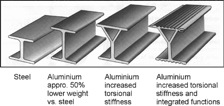 The ease with which aluminium alloys can be extruded to complex shapes makes valid the claim that it allows the designer to “put metal exactly where it is needed”, a requirement of particular importance with a relatively expensive material. Furthermore, this flexibility in design makes it easy, in most cases, to overcome the fact that aluminium and its alloys have only 1/3 the modulus of elasticity of steel (Figure 3). Since stiffness is dependent not only on modulus but also on section geometry it is possible, by deepening an aluminium beam by around 1,5 times the steel component it is intended to replace, to match the stiffness of the steel at half the weight. Also, at little added die cost, features can be introduced into the section shape which increase torsional stiffness and provide grooves for say fluid removal, service cables, anti-slip ridges etc. Such features in a steel beam would require joining and machining, thus adding to the cost and narrowing the gap between initial steel and aluminium costs. |