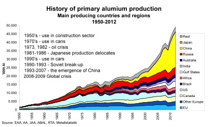The first target markets involved the substitution of copper, brass and bronze. Despite the initial difficulties, world production of aluminium soared from less than 200 tonnes in 1885 to approximately 50 million tonnes in 2012 - plus some 5 million tonnes of recycled aluminium. The prophecies of Dickens, Verne and Richards have come true!