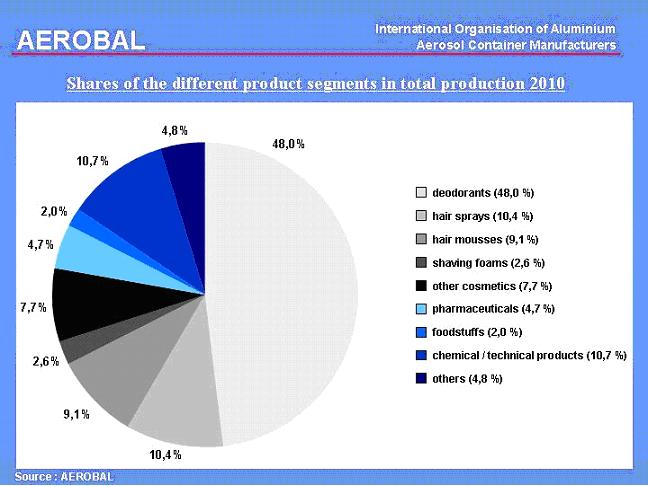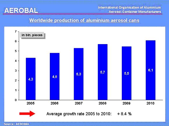 Aluminium aerosol cansAluminium aerosol cans – the success story continues… The booming demand for aluminium aerosol cans worldwide continued in 2010. Production rose by almost 11 per cent and broke through the 6-billion-can barrier. After taking a short breather in 2009, especially demand in Europe was very favourable recording a rise of 13 per cent. Shipments to South America also showed double-digit growth, while growth rates in Asia, which had been one of the driving forces for growth in 2009, were in single figures. |