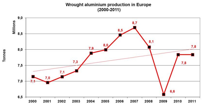 Production of wrought aluminium (rolling, extrusions and wirerod) has increased from 7.1 million tonnes in 2000 to 8.7 mil tonnes in 2007, before dropping to 6.6 during the crisis in 2009. Since then, the wrought aluminium production in Europe has recovered in 2010 by around 19% and remained stable in 2011.